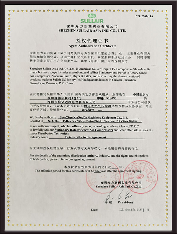 深圳市信诺达机电设备有限公司 于2002年5月注册成立, 并得到了寿力 公司的大力支持和认可,公司有多名在寿力系统工作多年的销售工程师和售后 服务工程师,公司所有维修人员都通过了寿力公司的专业维修考试,对螺杆式 空压机和后处理设备的 维修和保养有丰富的经验。